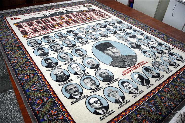 Manisa Valiliği'nin, Erzurum Kongresi'ni anlatan halı talep etmesi üzerine bu konuda araştırmaya başladığını anlatan Aksakal, ''Halıya Erzurum Kongresi'nin yapıldığı bina, kongreye katılanlardan aralarında Mustafa Kemal Atatürk'ün de bulunduğu 43 üye ve kongrede alınan bazı kararları işlemeye karar verdim. Desen çiziminin ardından halıyı 3 kişilik ekibimle işlemeye başladım. İpekten yapılan hereke halının bir santimetrekaresinde 36 kapalı düğüm var. 5 ayda tamamladığımız ve 43 farklı rengin kullanıldığı halıda 7 milyon düğüm bulunuyor. Halının eni 170, boyu ise 260 santimetre'' dedi.
