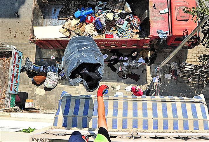 Binanın 3'üncü katı ve teras bölümü ile merdiven boşluklarındaki çöpler, belediyeye bağlı 10 personel tarafından kamyonlara yüklendikten sonra götürüldü.