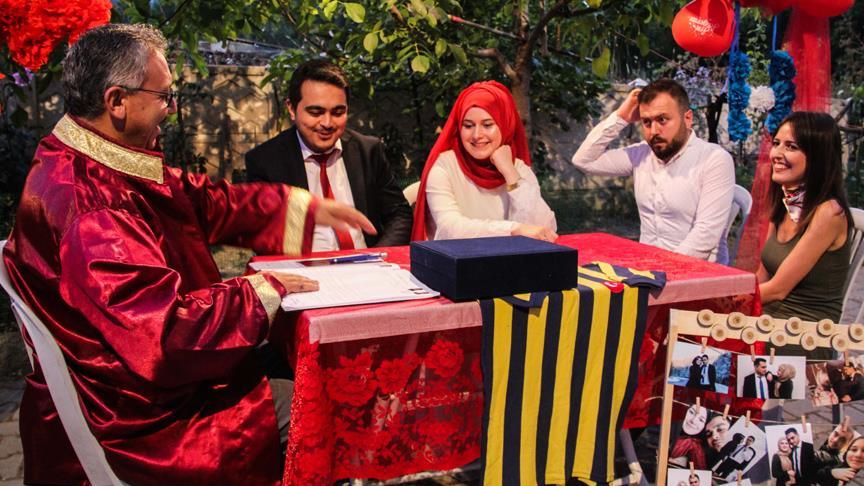 Nikah memuru Nevzat Efe'nin kıydığı nikahta genç çift, Dünya Fenerbahçeliler Günü'nde saat 19.07'de nikah defterine imza attı.