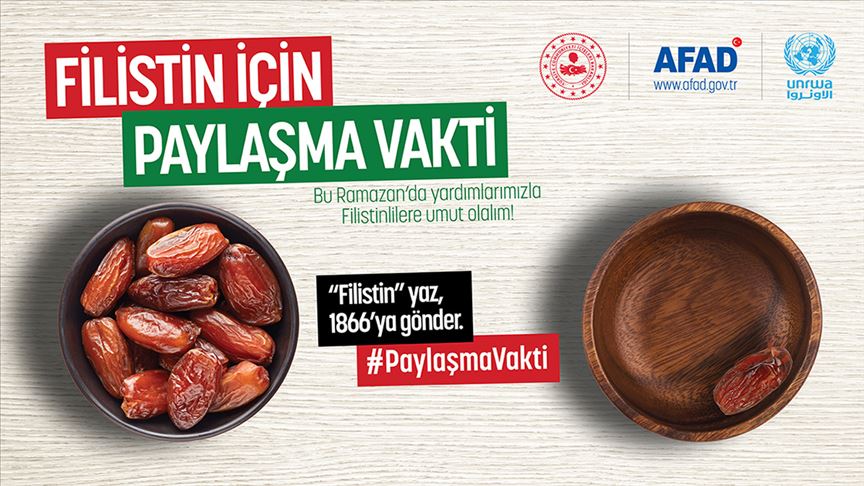 Afet ve Acil Durum Yönetimi Başkanlığı (AFAD) ve Birleşmiş Milletler Filistin Mültecilerine Yardım Ajansı (UNRWA), Filistin halkına destek olmak için "Filistin için Paylaşma Vakti" sloganıyla yeni bir yardım kampanyası başlattı.