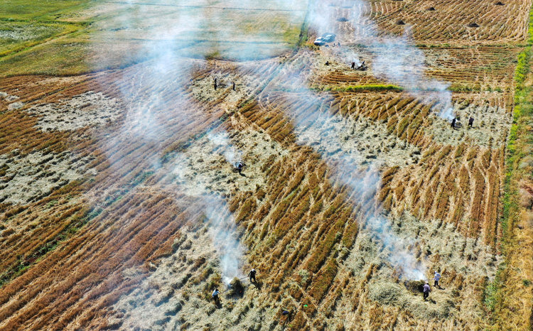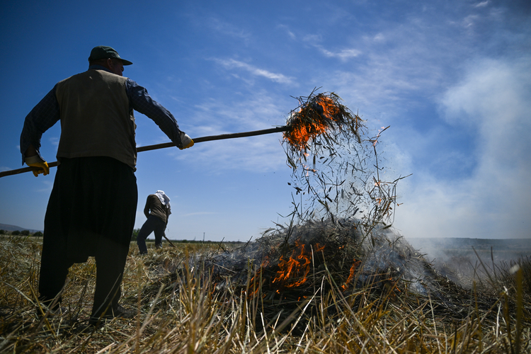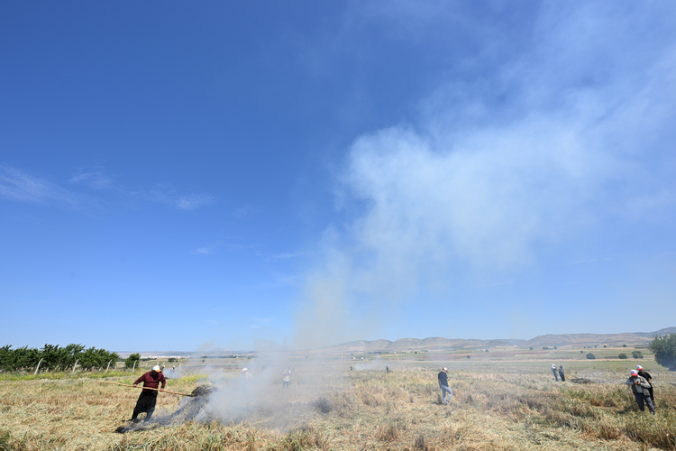 Hava sıcaklığının zaman zaman 35 dereceleri gördüğü tarlada çalışan çiftçiler, küçük yığınlar halinde topladıkları başakları, bir gün kurumaya bıraktıktan sonra ateşle kavuruyor.