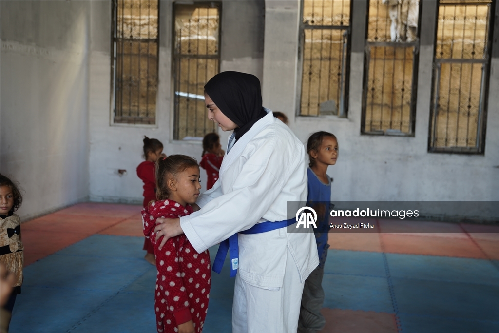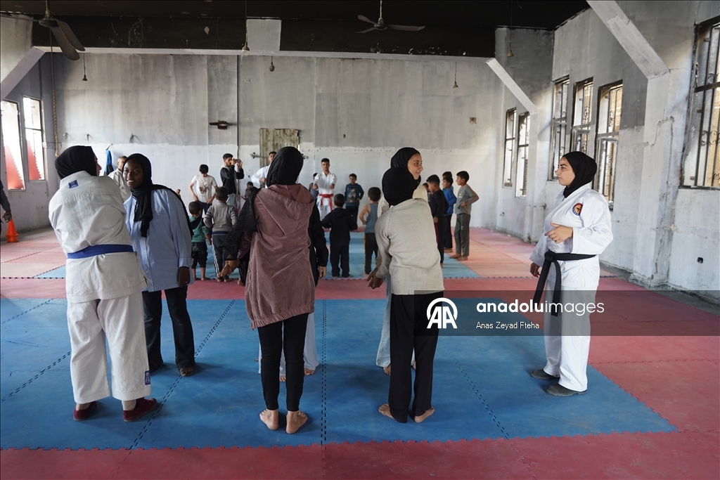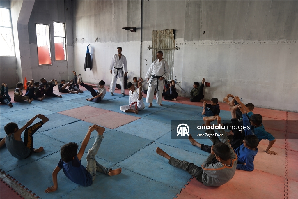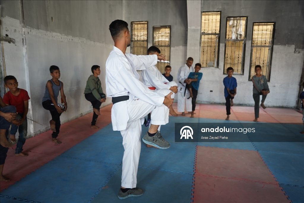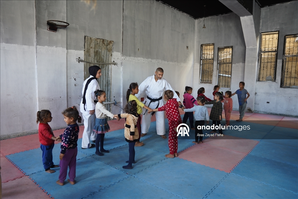 Antrenörler, İsrail'in saldırıları sonucu büyük hasar almış ve yakılmış olan Meştel Spor Kulübünde çocuklara yeniden savunma sporları öğretmeye başladı.