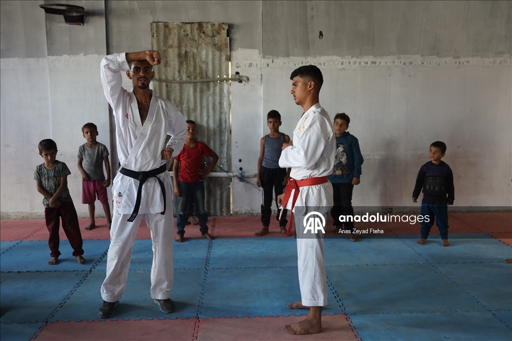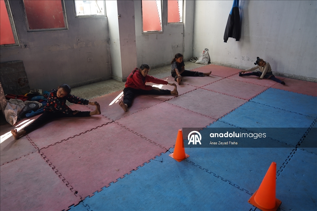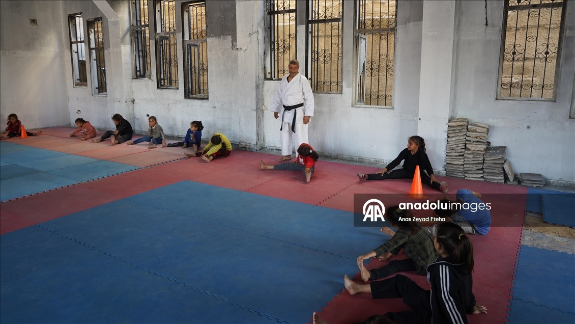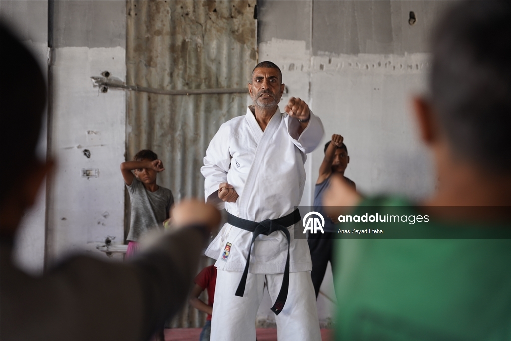 Antrenörler, İsrail'in saldırıları sonucu büyük hasar almış ve yakılmış olan Meştel Spor Kulübünde çocuklara yeniden savunma sporları öğretmeye başladı.