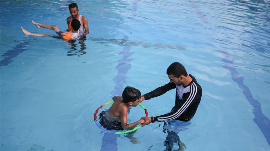 İsrail ablukası altındaki Gazze'de otistik çocuklar için ilk kez düzenlenen yaz kampında yüzmeyle tedavi yöntemi uygulanıyor.