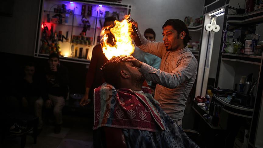 Gazze'nin güneyindeki Refah kentinde berberlik yapan Ramazan Advan, yaşanan elektrik kesintileri nedeniyle saç tıraşında ateşle yakma yöntemini kullanmaya başladı.