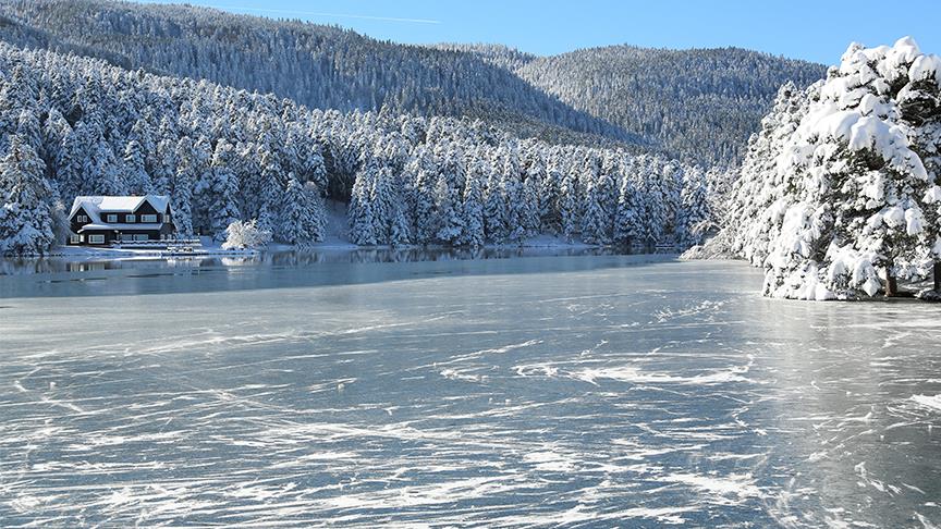 Gölün donan suyu ve çevresindeki ağaçları saran beyaz örtü, kartpostallık manzaralar oluşturdu.