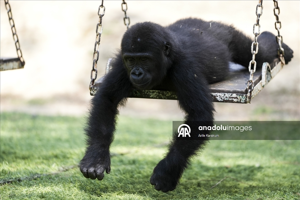 Nesli tükenme tehlikesi altında olan "gorilla gorilla" cinsi yavru, cam odada gözetim altından çıkarak, hayvanat bahçesindek doğal alanında bakıcılarıyla birlikte oyun oynuyor.
