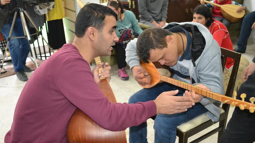 Aksaray'da görme engelli müzik öğretmeni Cuma Ali Sinankılı, Down sendromlu öğrencilere saz kursu veriyor.