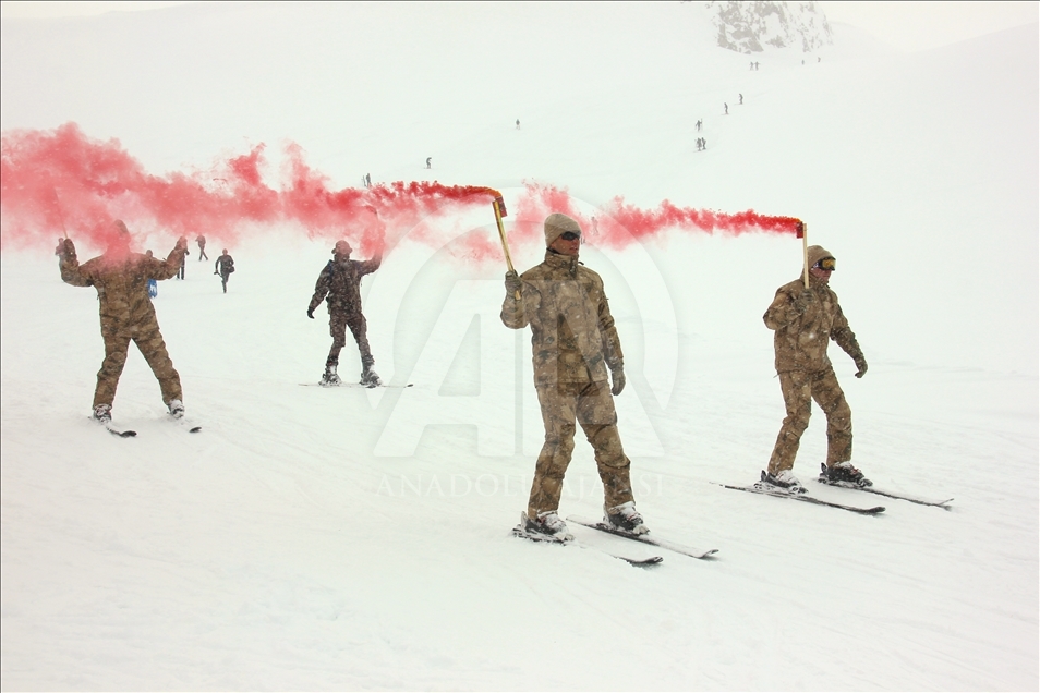 Konuşmaların ardından başlayan gösterilerde, Türk bayrağı ve meşalelerle zirveden inen kayakçılar ve güvenlik güçleri, ellerindeki bayrağı protokol üyelerine teslim etti.