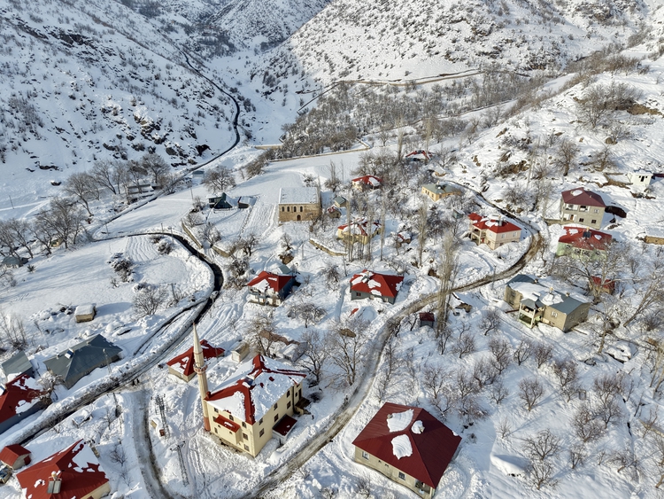Hakkari'nin Şemdinli ilçesinde etkili olan kar yağışıyla beyaza bürünen tarihi yapılar dronla kaydedildi.