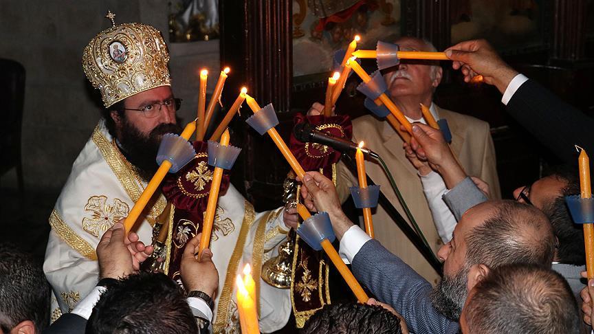 Kilisenin ışıklarla süslendiği ayinde, dualar edilip mumlar yakıldı. Bayram nedeniyle yumurtalar tokuşturuldu.
