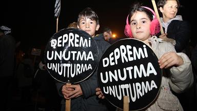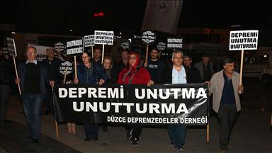 Düzce Belediyesi önünde toplanan vatandaşlar, ''Depremi unutmadık, unutturmayacağız'' ve ''Sağlam binalar istiyoruz'' yazılı pankartlar ve el fenerleriyle Anıtpark'a yürüdü.