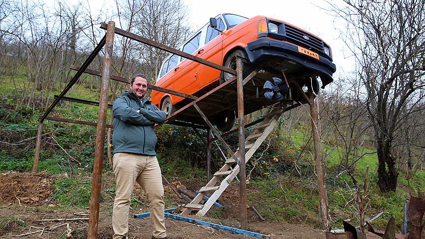 "Minibüsün durumu çok kötüydü. Üzerindeki pasta ve boya işlemlerini ben kendim gerçekleştirdim. Güzel görünmesi için dışarısında bir iki düzeltme yaptık. Daha sonra minibüsü havada tutacak olan demir direkleri araziye betonla yerleştirdik. Direkler arasındaki bağlantıyı da kaynaklarla gerçekleştirdik. Son olarak da vinç getirdik ve onun yardımıyla minibüsü direklerin üzerine koyduk."
