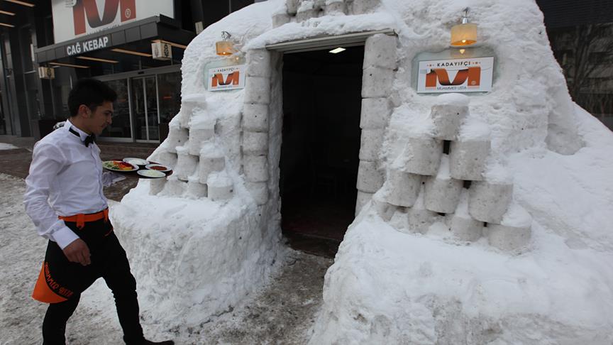 Türkiye'nin kış turizmi merkezlerinden Erzurum'da restoran işleten Muammer Tanhaş, yöresel lezzet cağ kebabını iş yerinin önüne yaptırdığı "iglo evde" müşterilerine sunuyor.