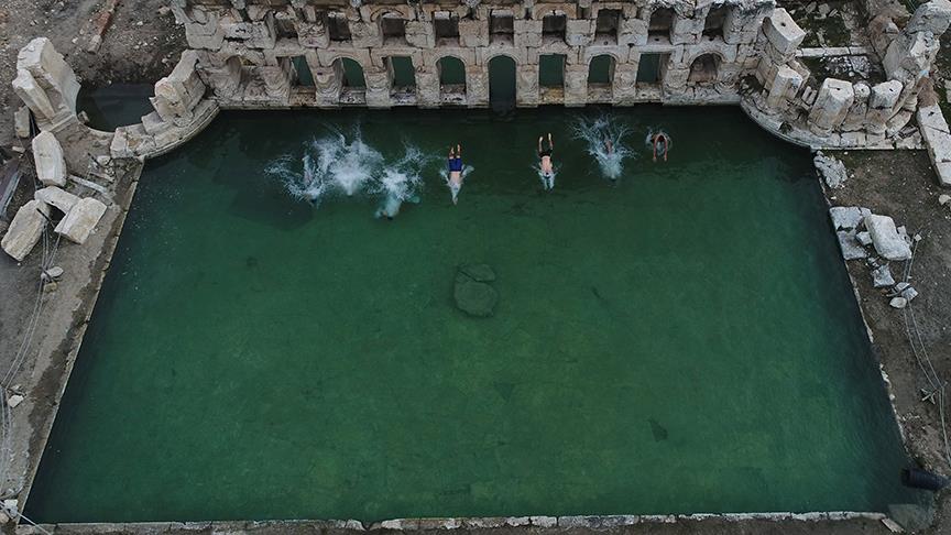 İlçede çalışmalarını yürüten yüzücüler, kış mevsimi olmasına karşın, su sıcaklığıyla uygun bir ortam oluşturan havuzda, iki bin yıllık tarihle iç içe yüzme imkanı buldu.