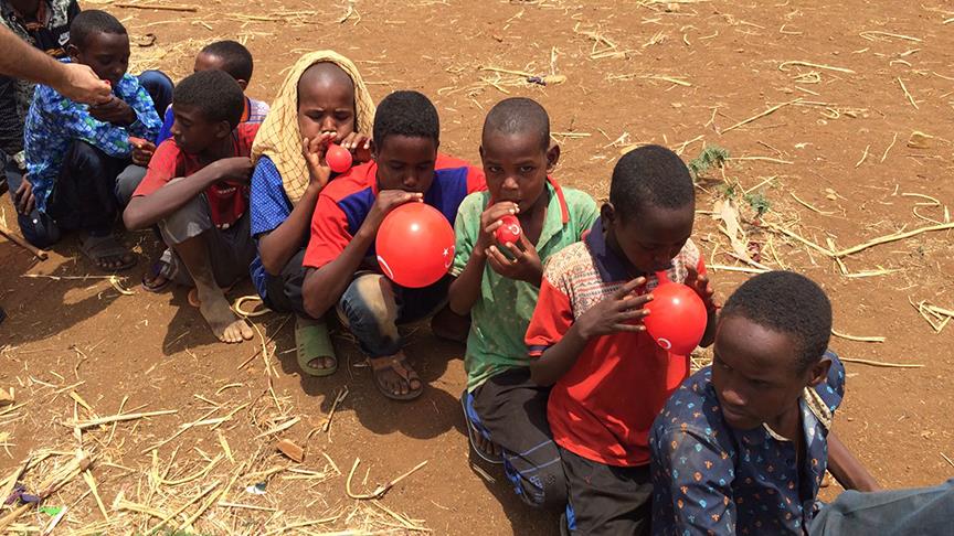 Kurban Bayramı'nda ihtiyaç sahiplerine yardım elini uzatmak üzere Somali'de bulunan Bursa İHH İnsani Yardım Derneği yetkilileri, et dağıtımının ardından çocuklara balon ve şekerleme gibi hediyeler verdi.