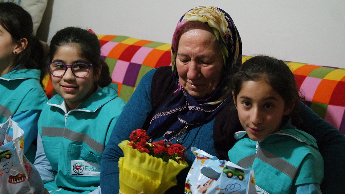 İlkokul öğrencileri felçli eşine tek başına bakan kadının yüzünü güldürdü