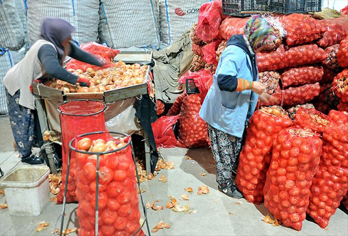 Bursa'ya yakın illerden çuvallarla getirilen patates, domates, soğan, elma, portakal gibi sebze ve meyveler, 132 iş yeri ile 34 büfe ve lokantanın bulunduğu halde yaklaşık 35 kadın işçi tarafından ayıklanıyor.