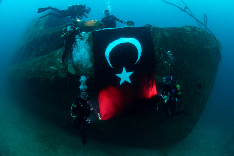 Önemli dalış noktalarından İzmir'in Karaburun ilçesinde, dalgıçlar kentin düşman işgalinden kurtuluşunun 102'nci yıl dönümünü su altında Türk bayrağı açarak kutladı.