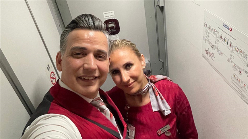 Yaklaşık 23 yıldır kabin memurluğu yapan Burçin ve Cem Işıksaçan çifti, "Dünya Kabin Memurları Günü" için havadan kutlama mesajları kaydederek, birbirlerini ve meslektaşlarını tebrik etti.