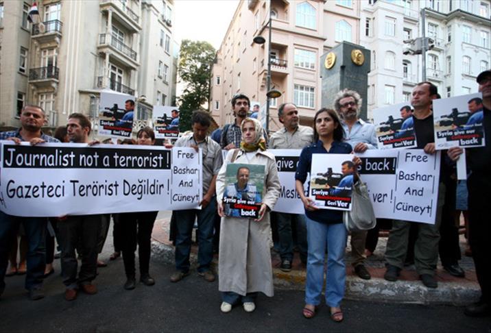 Teşvikiye Caddesi'ndeki Başkonsolosluk önünde toplanan gazeteciler ile Ünal'ın eşi Nuran Ünal ve Kadumi'nin eşi Arzu Fehmi Kadumi, ellerindeki pankartlarla sloganlar atarak, gazetecilerin serbest bırakılmasını istedi.