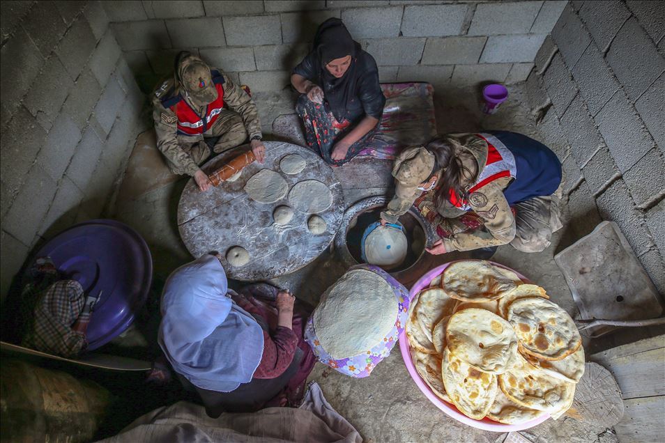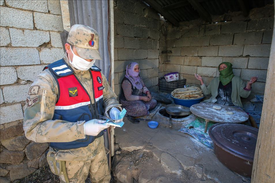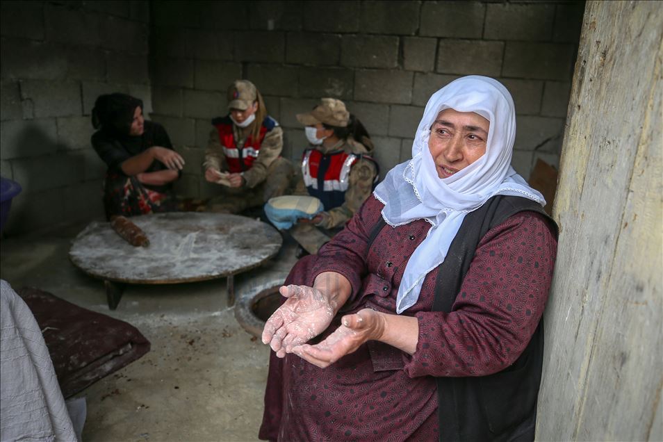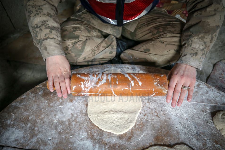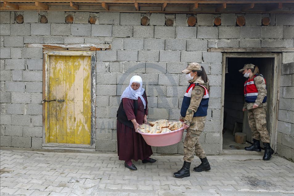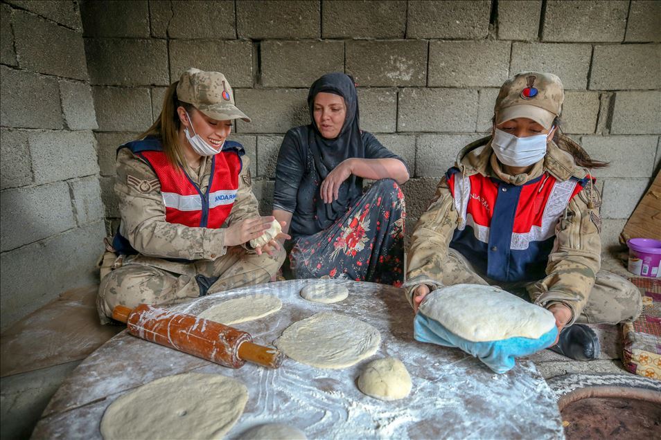 Van'da yeni tip koronavirüs (Kovid-19) tedbirleri kapsamında kırsal mahallelerdeki ihtiyaç sahibi ailelere sosyal yardımları ulaştıran İl Jandarma Komutanlığında görevli kadın komutanlar, Gürpınar ilçesinde ziyaret ettikleri evde hamur yoğurdu, tandırda ekmek pişirdi.