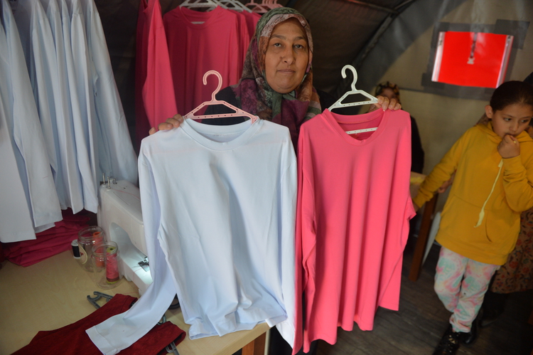 "Psikolojik, maddi, manevi yıprandığımız için projeyi kabul ettik. Çadır ortamı zorluyor olabilir ama biz onları hiç sıkıntı etmiyoruz. Tişört dikiyoruz çadırlarda. Daha sonra kendi işimiz olarak ilerleyecek. Psikolojik olarak kendimizi daha iyi hissettiğimiz için de geliyoruz. Biri 1, diğeri 3,5 yaşında iki çocuğumla kursa geliyorum. Onlar için de park yapıldı. Çocuklar orada oynarken biz işimizi yapmaya çalışıyoruz."