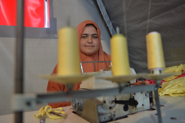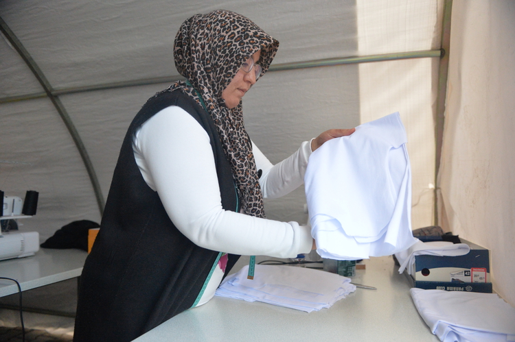 "Kumaş, iplik gibi ham maddeyi İstanbul'da faaliyet gösteren firmalarımız bağışladı. Dikiş makinesi olan hanımlarımız için burada üretim yapılabilecek altyapıyı kurduk. Üç eğitimci, hanım kardeşlerimize eğitim veriyor. Daha önce bu işi yapmamış olsalar bile hocalarımız vasıtasıyla eğitip üretime kazandırıyoruz. Uygulamalı eğitim veriyoruz. İşin başındayız, önümüzdeki hafta ürettiklerimizi pazarlamaya başlayacağız."