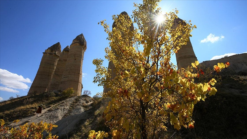UNESCO Dünya Kültür Mirası Listesi'ndeki Kapadokya, milyonlarca yıl önce oluşan peribacaları ve doğal kaya oluşumları, sararan yapraklarla ayrı bir güzelliğe büründü.