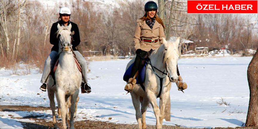 Kapadokya'nın merkezi konumundaki Nevşehir'in el sanatlarıyla ünlü ilçesi Avanos'taki at çiftlikleri, beyaz örtüye bürünen peribacaları arasında atlı gezi turları düzenliyor.