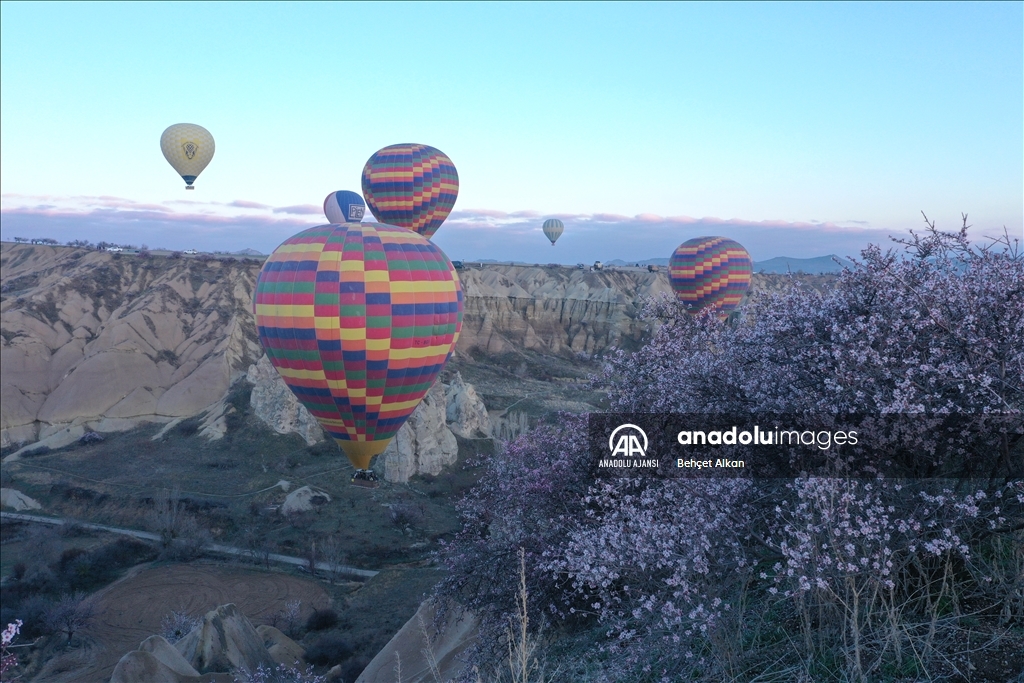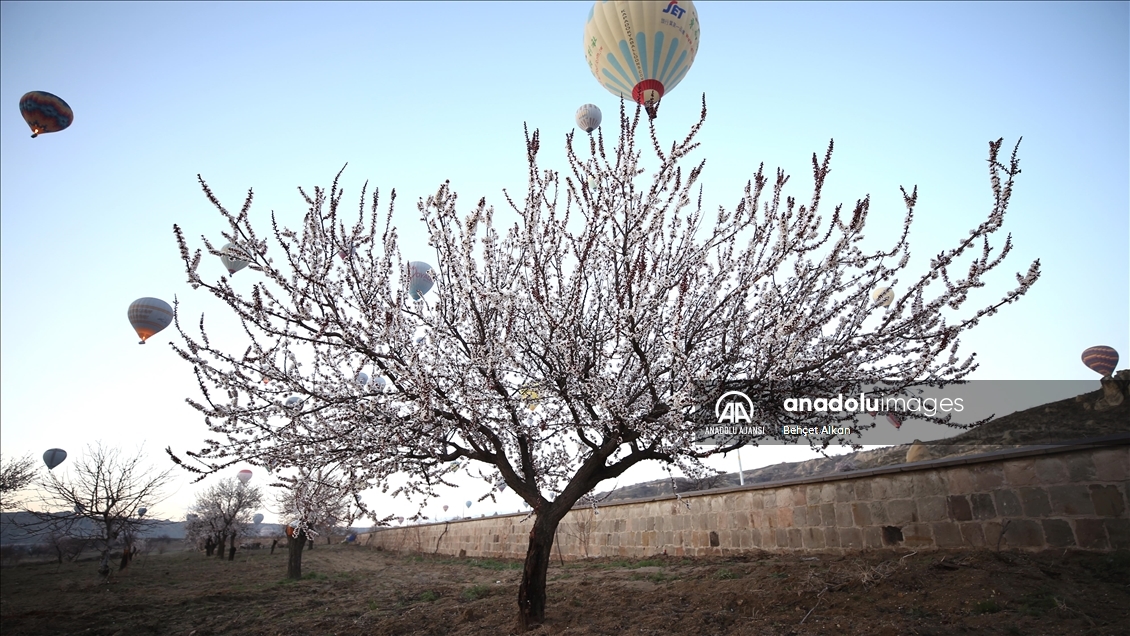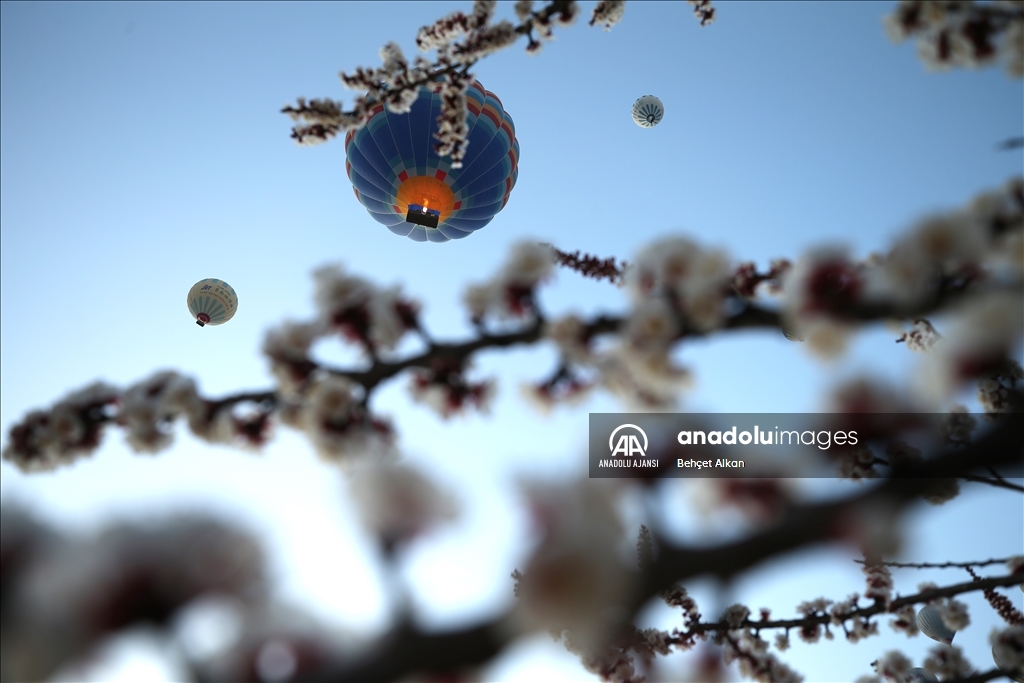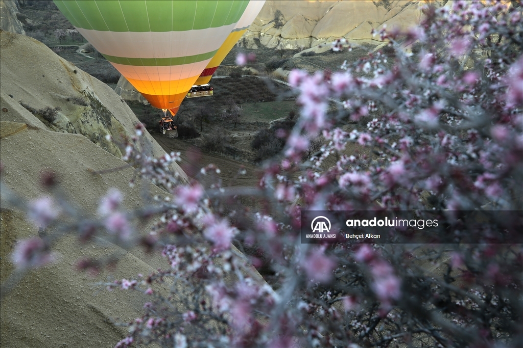 Türkiye'nin gözde turizm merkezlerinden Kapadokya'da, sıcak hava balon turuna katılan turistler, çiçek açan ağaçlarla kaplı vadilerin oluşturduğu manzarayı izledi.