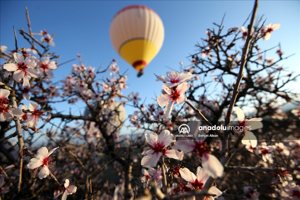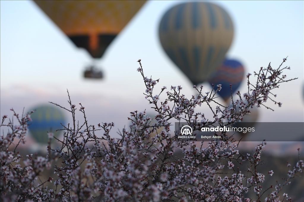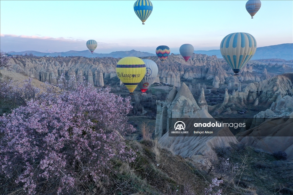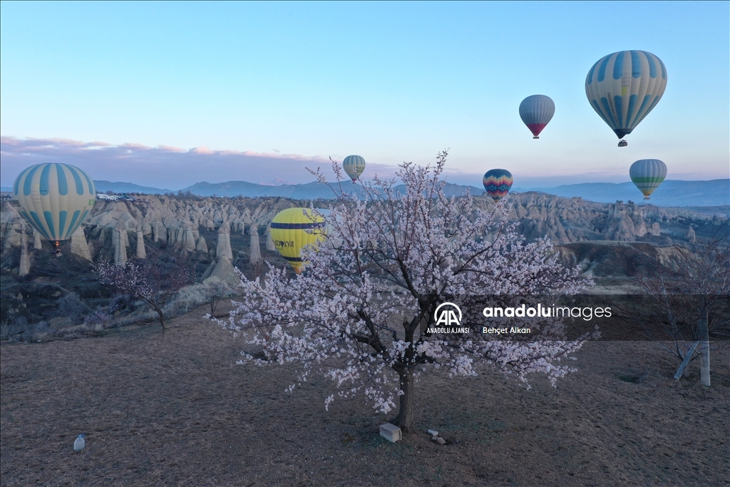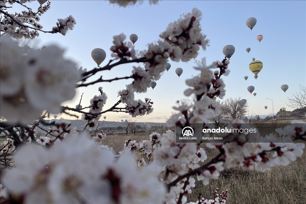 Türkiye'nin gözde turizm merkezlerinden Kapadokya'da, sıcak hava balon turuna katılan turistler, çiçek açan ağaçlarla kaplı vadilerin oluşturduğu manzarayı izledi.
