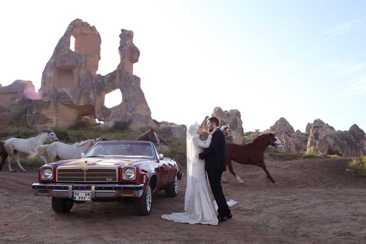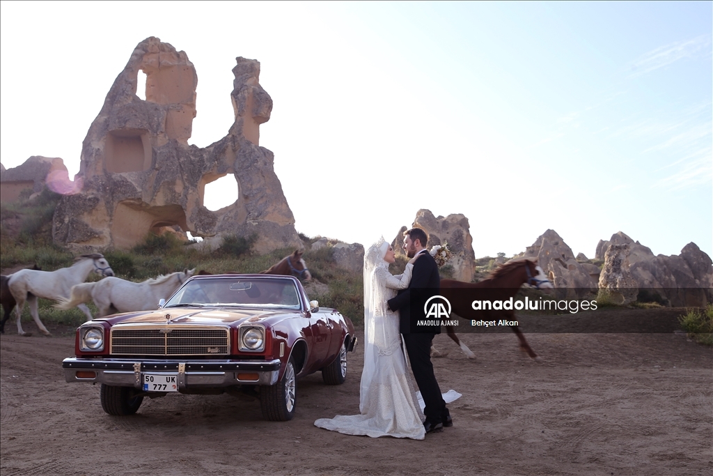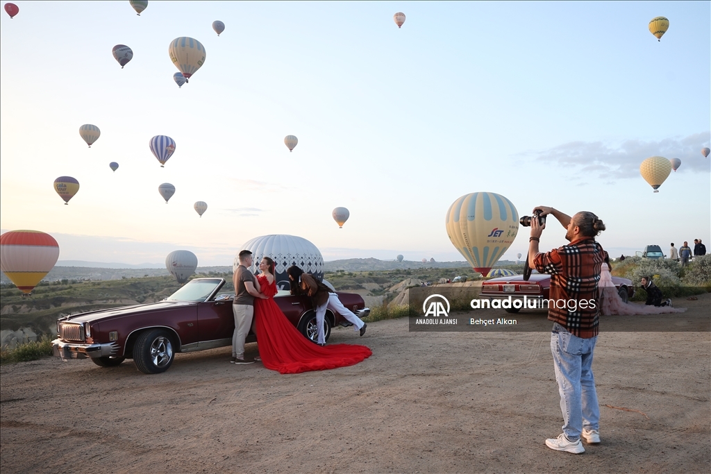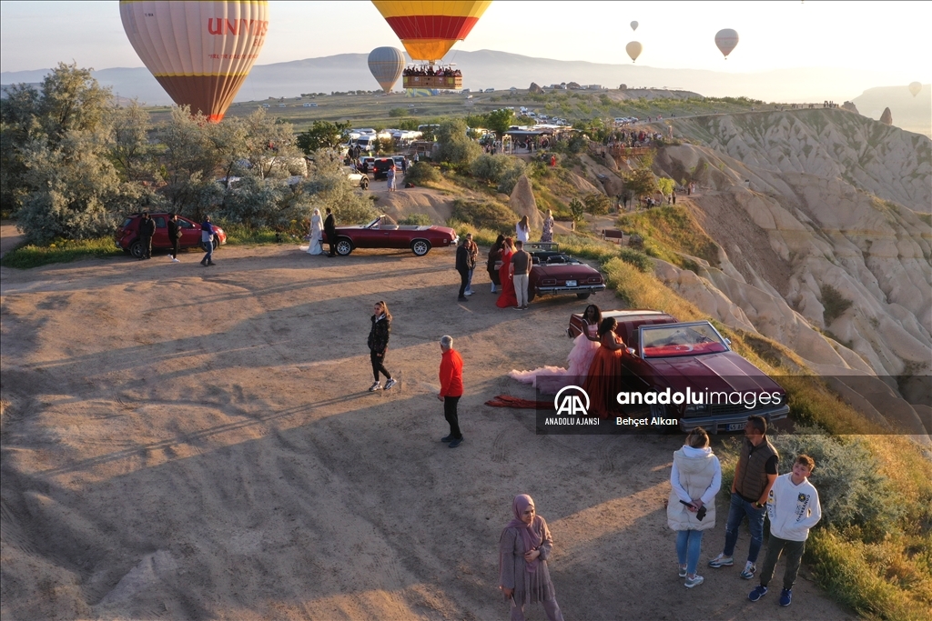 Ziyaretçilerin kimisi sıcak hava balonlarının oluşturduğu renkli görseli dekor yapıyor, kimi de kiraladığı klasik otomobille peribacaları arasında objektifin karşısına geçiyor.
