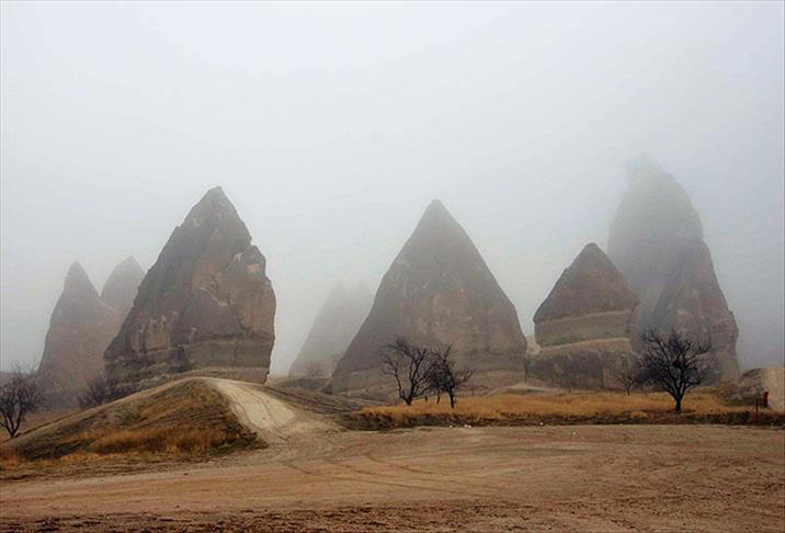 Kapadokya bölgesinin ilginç yeryüzü şekillerine eşlik eden sis tabakası güzel görüntüler oluşturdu.