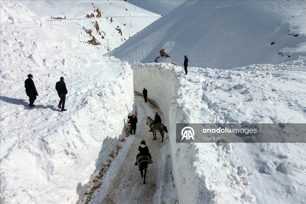 Van'ın Başkale ilçesine bağlı kırsal Sualtı Mahallesi'nde yaşayanlar, çığ nedeniyle metrelerce kar yığının bulunduğu bölgede açılan "kar koridoru"ndan geçerek ilçeye ulaşabiliyor.