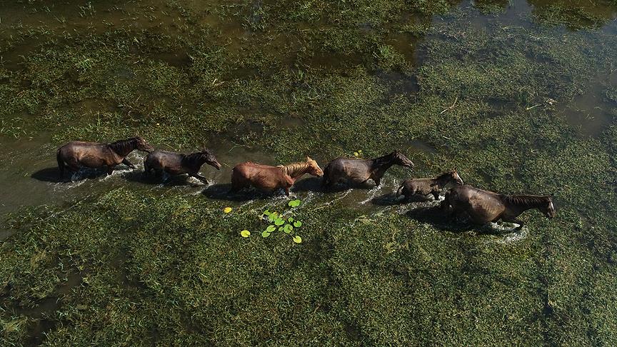 Karacabey Longozu ve Dalyan Gölü havzasına uyum sağlayan atlar, doğaya salınmalarından bu yana yaz kış sürüler halinde yaşıyor.