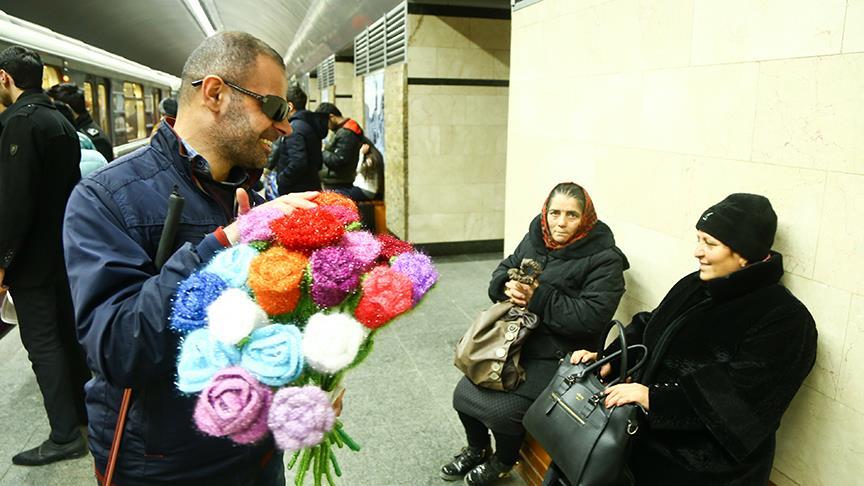 Azerbaycanlı görme engelli Elçin Abbasov (35), renkli ipliklerle ördüğü çiçeklerle karanlık dünyasını aydınlatıyor.