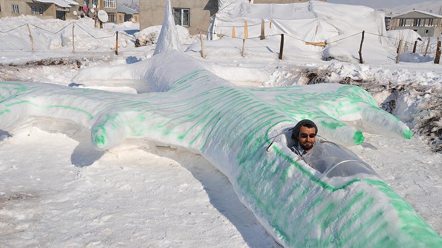 Hakkari'nin Yüksekova ilçesinde yaşayan inşaat işçisi Mehmet Şerif Karahan, evinin bahçesinde yaklaşık 10 metre uzunluğunda kardan savaş uçağı yaptı.