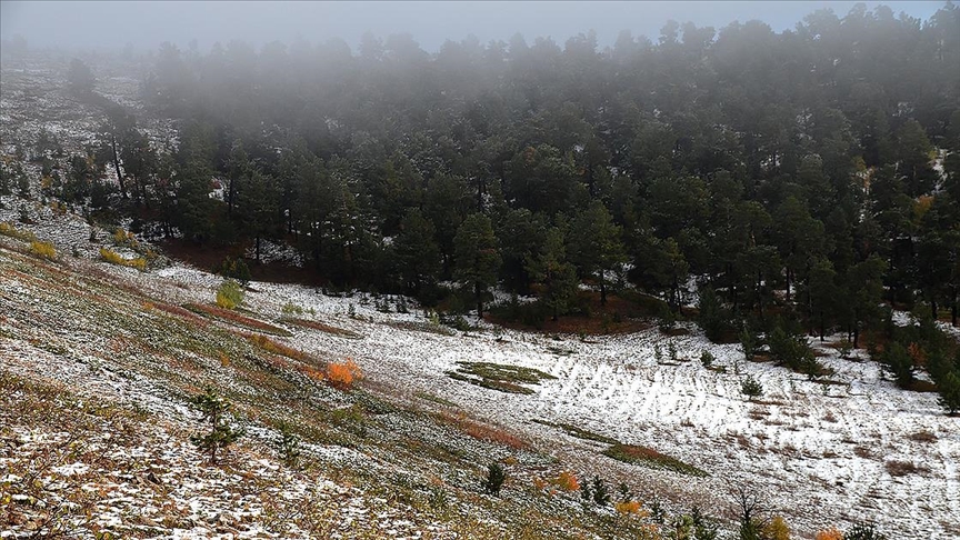 Sarıkamış Allahuekber Dağları Milli Parkı alanındaki Büyük Kumru Tepe ve Allahuekber Dağları'nda beyaz örtünün, sonbahar renklerinin hakim olduğu ormanla buluşması kartpostallık görüntüler oluşturdu.