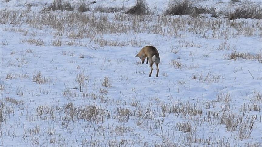 Karla kaplı arazide yiyecek arayan tilkinin avını yakalamak için karların arasına dalması ilginç görüntüler oluşturdu.
