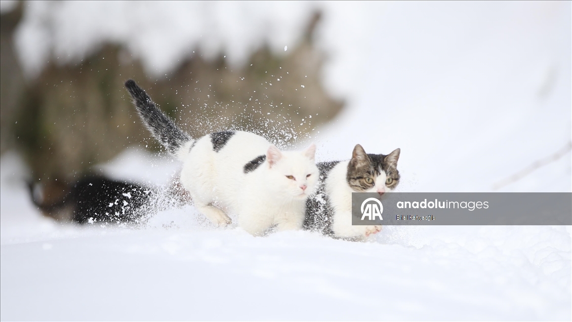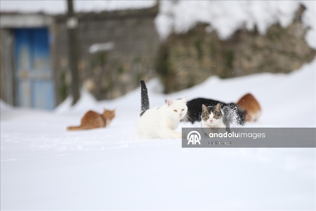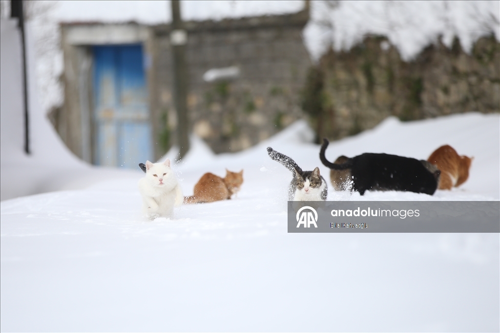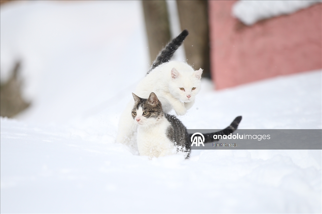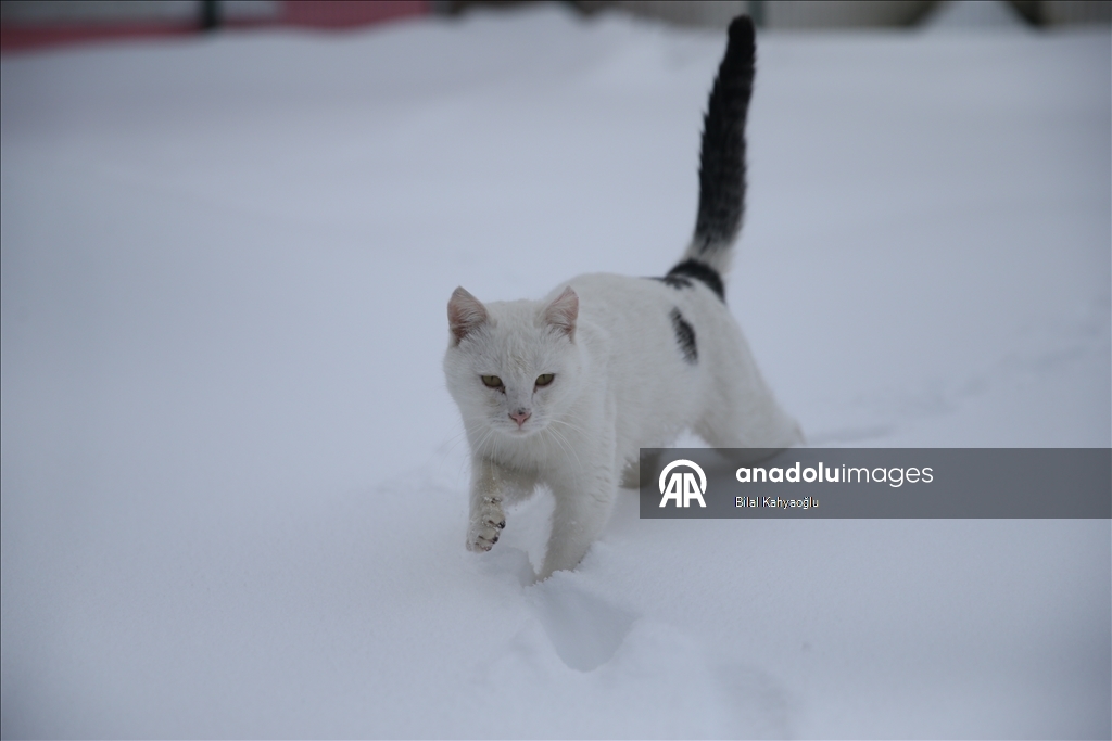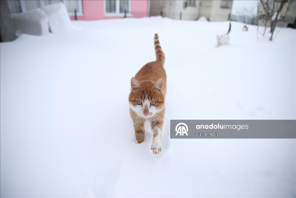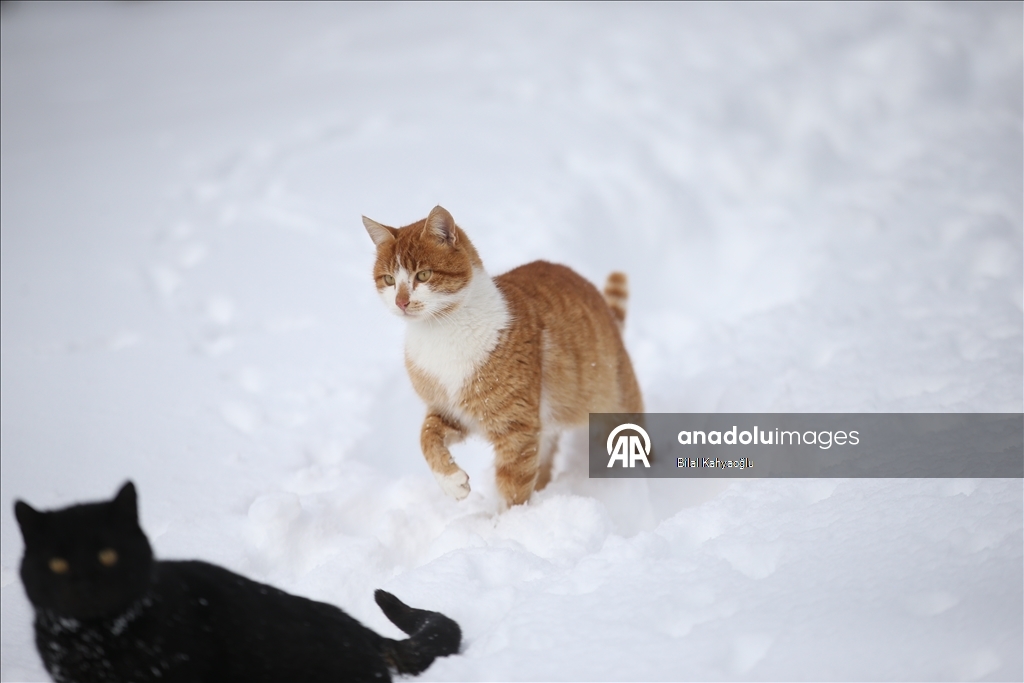 Şahin'in beslemek için seslendiği kediler, bir metreye yaklaşan karda ilerleyerek lojmanın önüne geliyor. Rıfat Şahin'in seslendiği kedilerin karda sıralı şekilde yürüdüğü anda çektiği görüntü ise sosyal medyada büyük ilgi gördü.