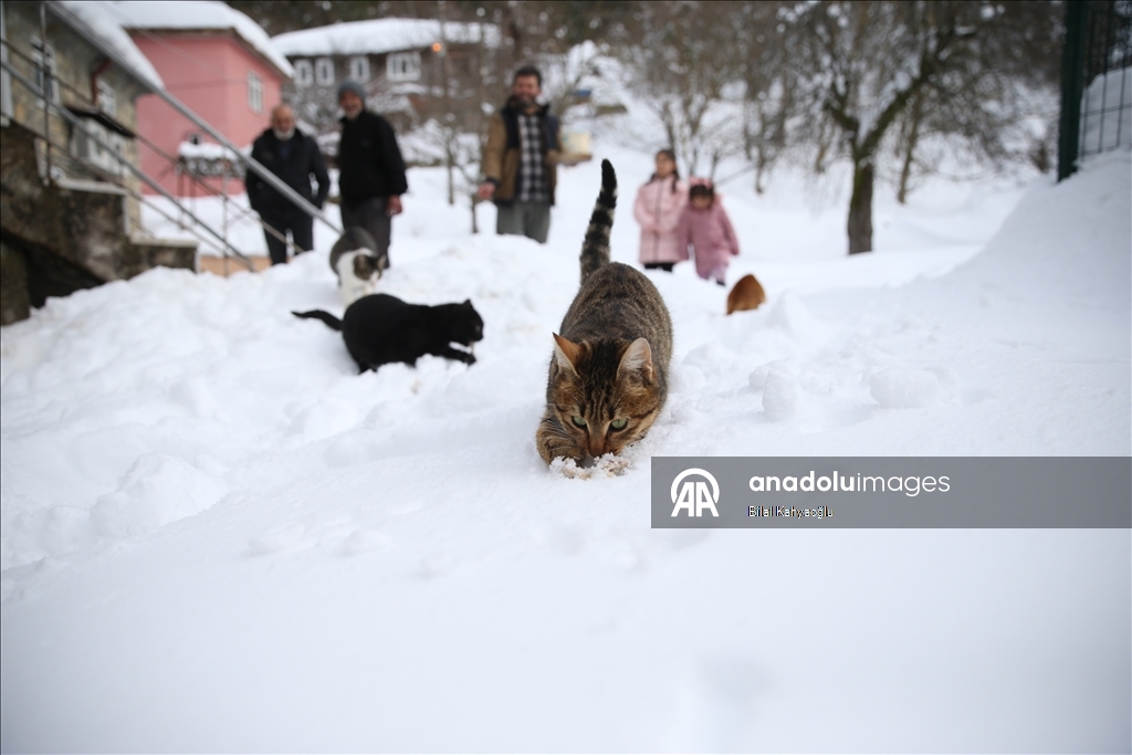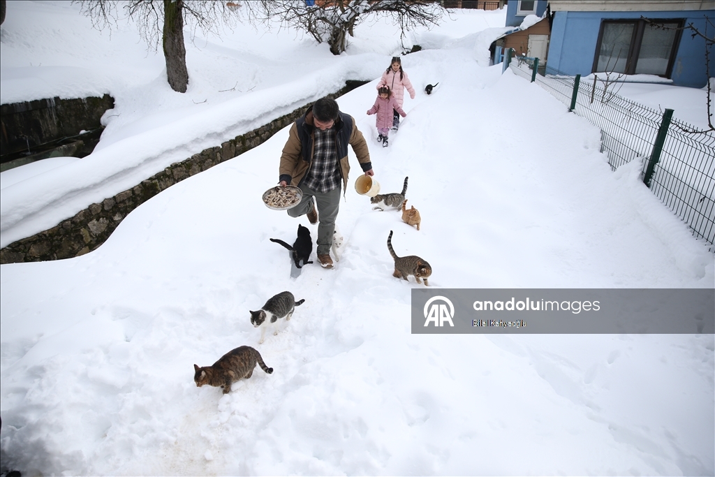 Köyün Tarakçılar Mahallesi Camisi'nde 10 yıldır imamlık görevinde bulunan 42 yaşındaki Rıfat Şahin ve ailesi, özellikle kış aylarında her gün düzenli olarak kedileri besliyor.
