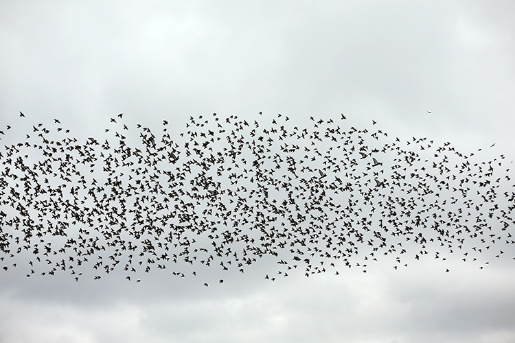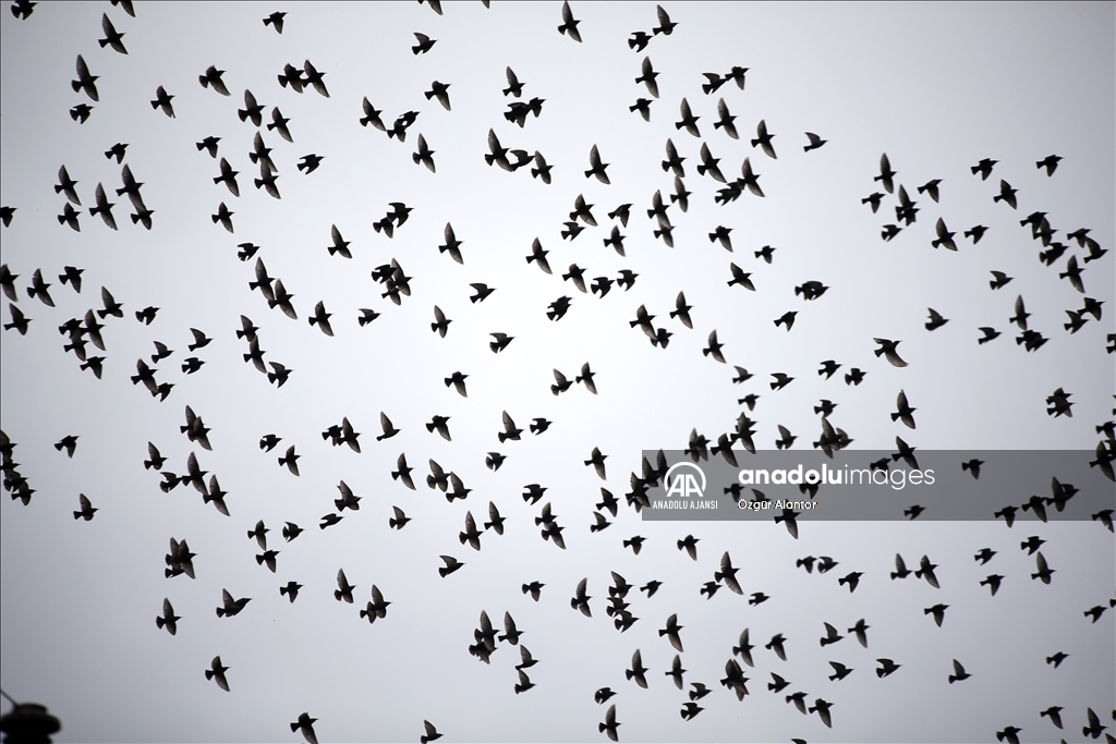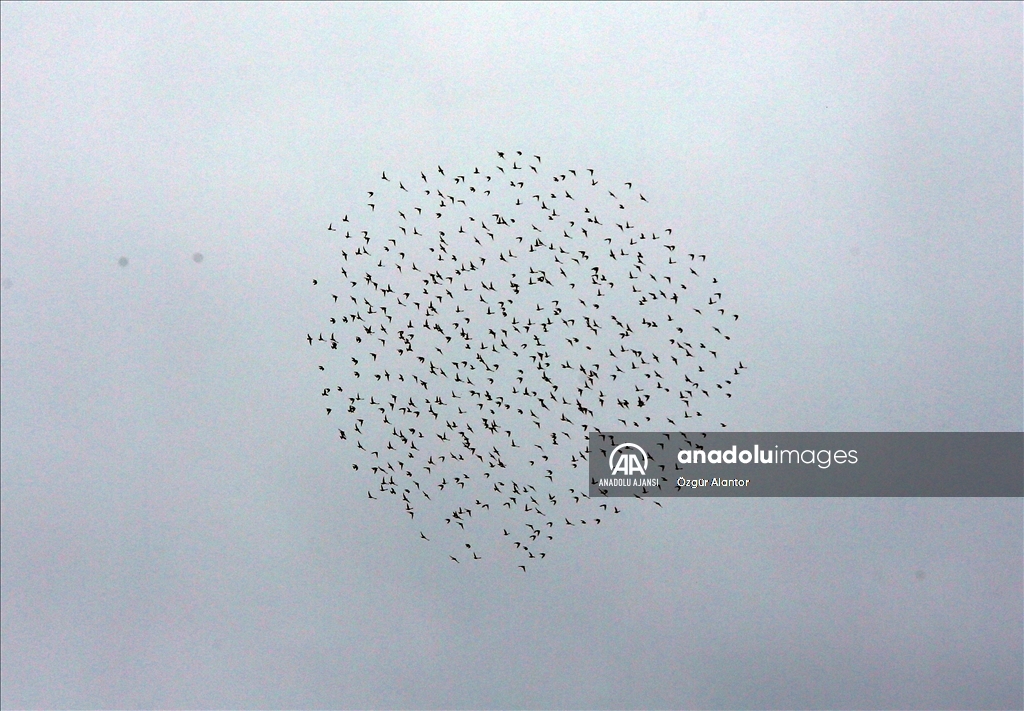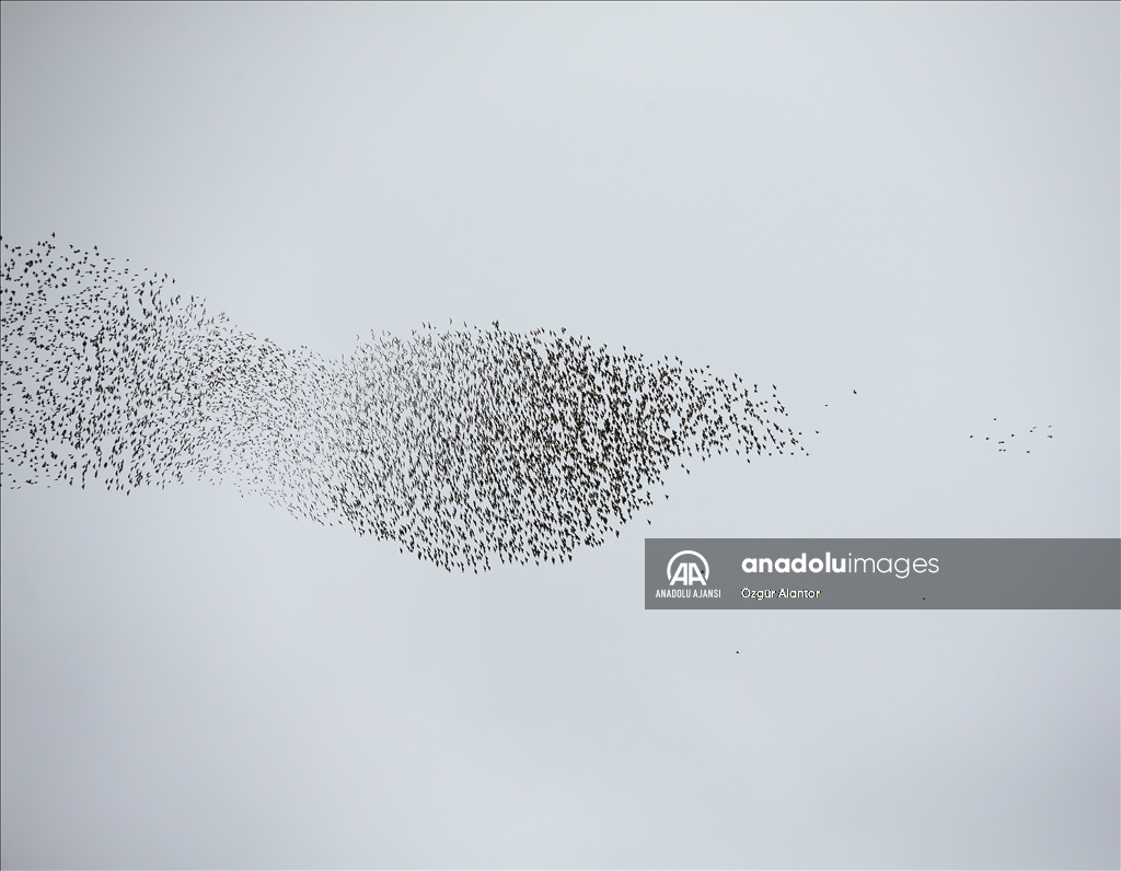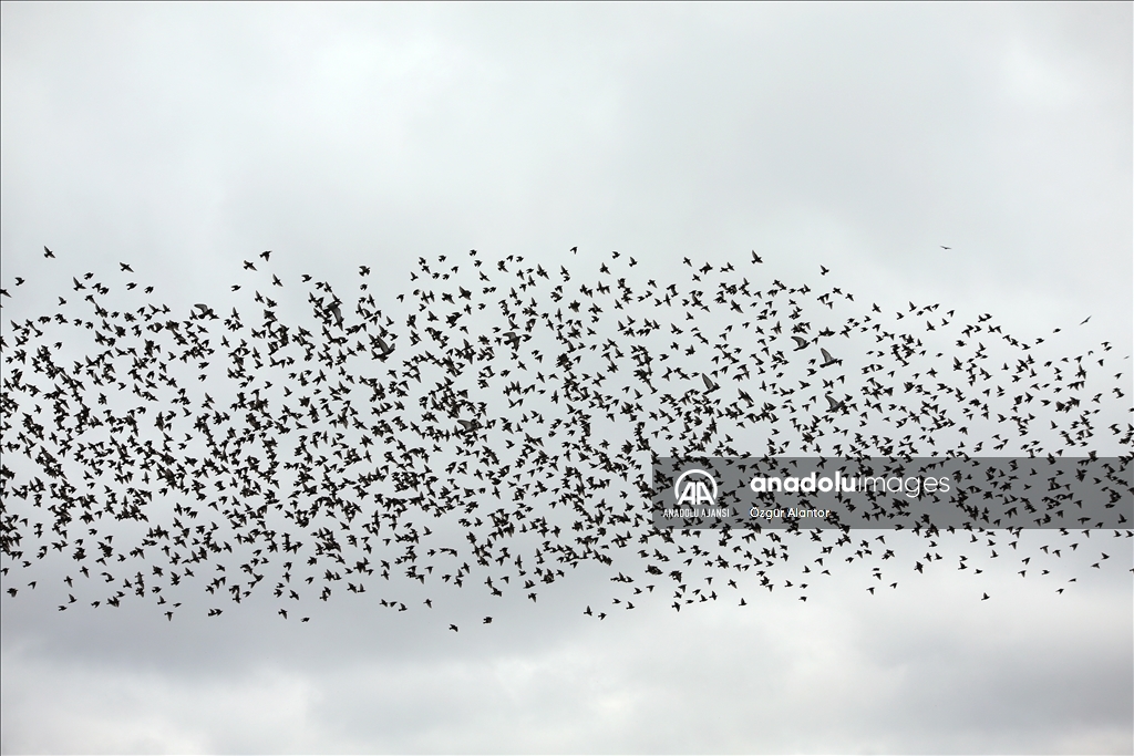 Havalanan yüzlerce sığırcık, bir koreografiye sadık kalırcasına eş zamanlı hareket ederek gökyüzünde adeta dans ediyor.