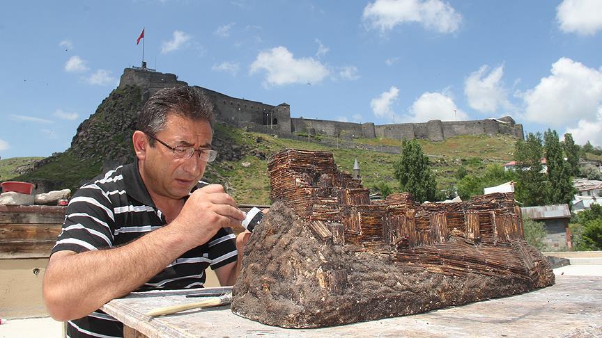 Kars'ta bir biblo sanatçısı, kibrit çöplerini sanata dönüştürerek Kars Kalesi'nin minyatürünü yaptı.