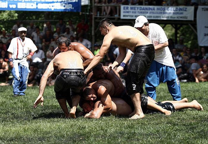 Bir ara adeta üst üste güreşen pehlivanlar güçlükle birbirinden ayrıldı.
