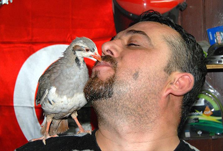 Ezine ilçesinde yaşayan motosiklet ve motorlu testere tamircisi Mehmet Koç, zamanının büyük bölümünü geçirdiği kınalı kekliğini ağzıyla besliyor.