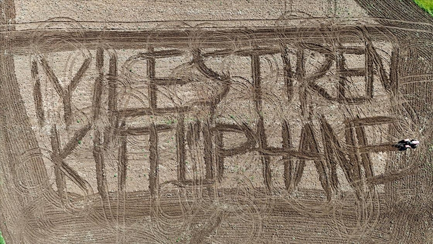 Tarlasına yazdığı kutlama mesajlarıyla bilinen çiftçi Burak Tunçkol, Kütüphane Haftası dolayısıyla farkındalık oluşturmaya karar verdi.