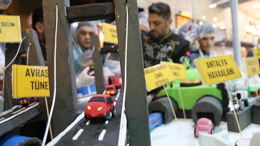 Üzerinde Marmaray, Yavuz Sultan Selim ile Osmangazi köprüleri, İstanbul'daki üçüncü havalimanı, Erzurum Kop ile Bolu Dağı tünelleri, Sinop Nükleer Santrali, hızlı tren gibi projelerin figürlerinin yer aldığı pasta, 23 Nisan'da Cumhurbaşkanı Recep Tayyip Erdoğan'a sunulmak üzere külliyeye götürülecek.