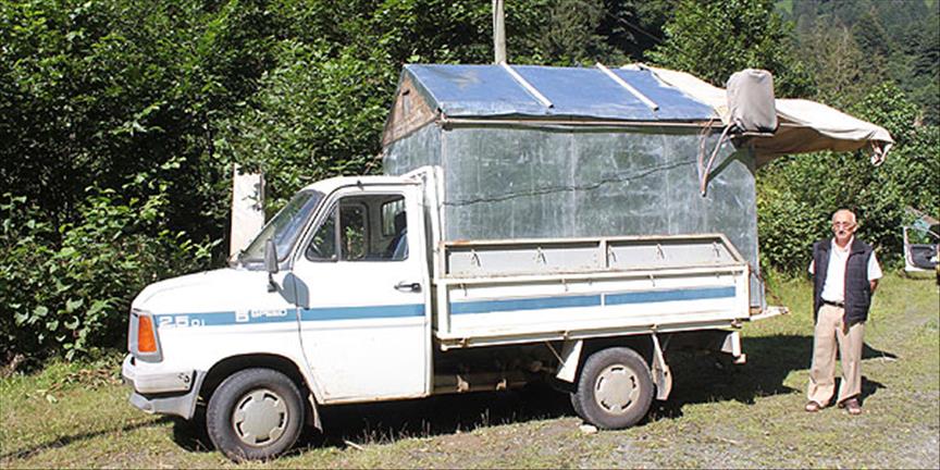 Arılarını araziye götürmediği dönemlerde aracını bir karavan gibi kullandığını belirten Topaloğlu, ''Bu yıl sağlık sorunu yaşadığım için kovanları Erzurum ya da Artvin'e götürmeye cesaret edemedim. Kovanlar köyde, korunaklı yerdeler. Bu nedenle aracı bir karavan gibi kullanıp tatile çıkabiliyorum. Küçük ama bana yetiyor. Şimdi de Ayder Yaylası'na tatile geldim'' diye konuştu.
