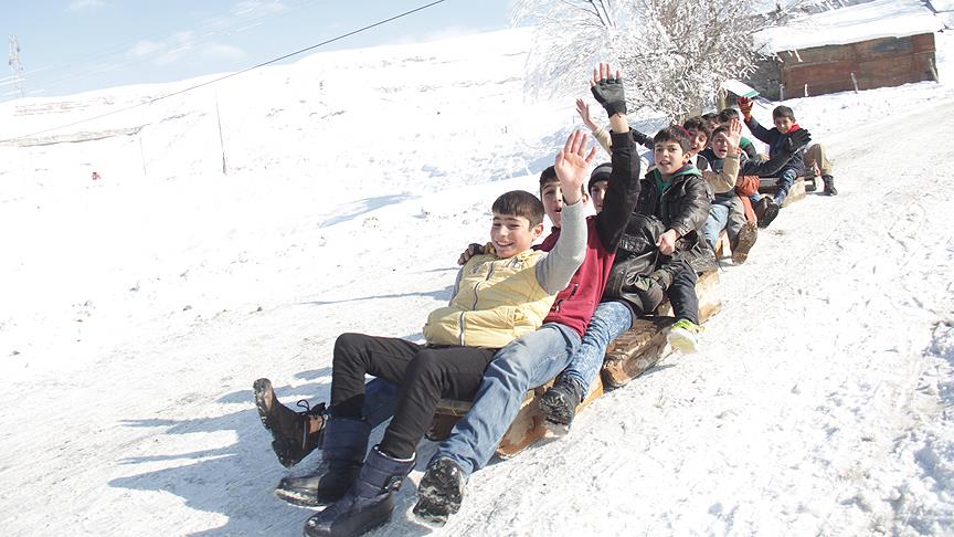 Çocuklardan Kerimcan Gürbüz de başka köyde öğrenim gördüklerini ve kendi köylerine geldiklerinde kayak yaptıklarını belirterek, "Hafta sonu olduğu için kızakları alıp yokuştan aşağı kayıyoruz. Kardan adam yapıyoruz, kartopu oynuyoruz. Burada kayak yaparak eğleniyoruz." diye konuştu.